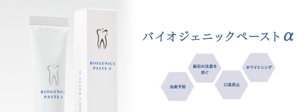 バイオジェニックペーストα 自然の力で歯と健康を守る ハミガキペースト 自然の力で歯と健康を守る化学薬品を一切使用しない最先端の統合医学から生まれた歯磨きペーストです。 安全性と効果を両立させるバイオジェニックペーストαの2つのバイオ技術 お子様・高齢者・妊娠中の方にも安心安全! セラミックやベニア・クラウン・インプラントの歯でもしっかり磨けます。 バイオジェニックスでお口の中から全身の健康までケア! POINT01 優れた洗浄力「バイオミネラル」 POINT02 善玉菌を育て悪玉菌を増えにくい環境へ 最先端のプロバイオティクス 「バイオジェニックス」 化学薬品を使用せず作られた歯磨きペーストなので、お子様・高齢者。妊娠中の方でも安心してお使いいただけます。 従来の「アンチバイオティクス」のみの歯磨きでは、強力殺菌することによって悪玉菌だけではなく善玉菌まで殺菌されている可能性があります。全て殺菌された後のお口の中では悪玉菌が優勢なため増殖しやすい状態に陥ってしまいます。そこで、バイオジェニックペーストαでは「バイオミネラル」のもつ強アルカリ・強還元力でしっかりお口の中を洗浄し、「プロバイオティクス」で善玉菌を積極的に取り込み、さらに「バイオジェニックス」で善玉菌を育て、何倍も活性化させる事によって、悪玉菌が増えにくい環境を作ることが出来ます。 バイオジェニックス成分 BRMS(バームス) 16種類の乳酸菌と24種類の酵母によって作られた計40種類の善玉菌の餌になる善玉菌分泌エキスです。口腔内で働く善玉菌の増殖を助け、口腔内での善玉菌のバランスを保つことが出来ます。日本・アメリカ・カナダで製造特許を取得しています。 プロバイオティクス成分 クリスパタス菌 出産時に母親の産道を経由して受け継がれる乳酸菌です。乳幼児の腸内から多く発見される機能性乳酸菌です。東京大学、信州大学、日本大学松戸歯学部等の研究機関により研究開発が進められた産道に存在する新しい乳酸菌です。 ご購入はこちら