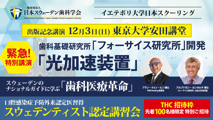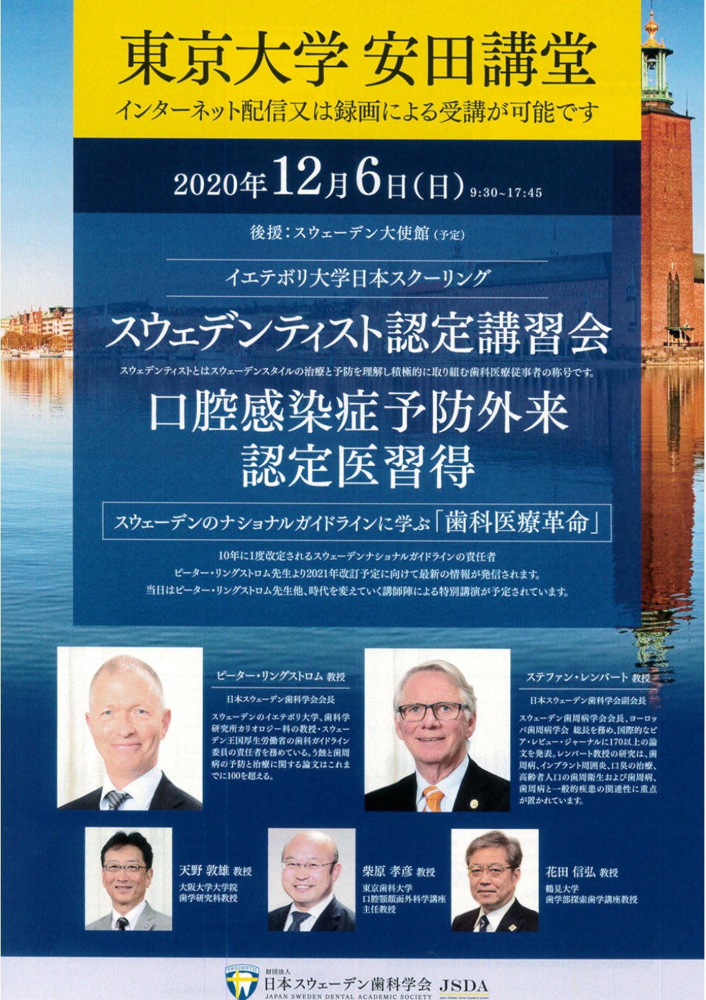 イエテボリ大学カリオロジー科主任教授ピーター・リングストロム教授、ヨーロッパ歯周病学会会長のステファン・レンバート教授をお招きし、歯科の最先端治療を実践しているスウェーデン式歯科治療についての講習会を主催しています。2017年東京、2018年大阪・東京、2019年東京と3年連続で開催している本講習会は2020年12月に東京大学安田講堂での開催が決定するなど、スウェーデンを始めとする世界各国と医療交流を続けており、世界最先端の技術や製品と日本医療のパイプ役として尽力しております。